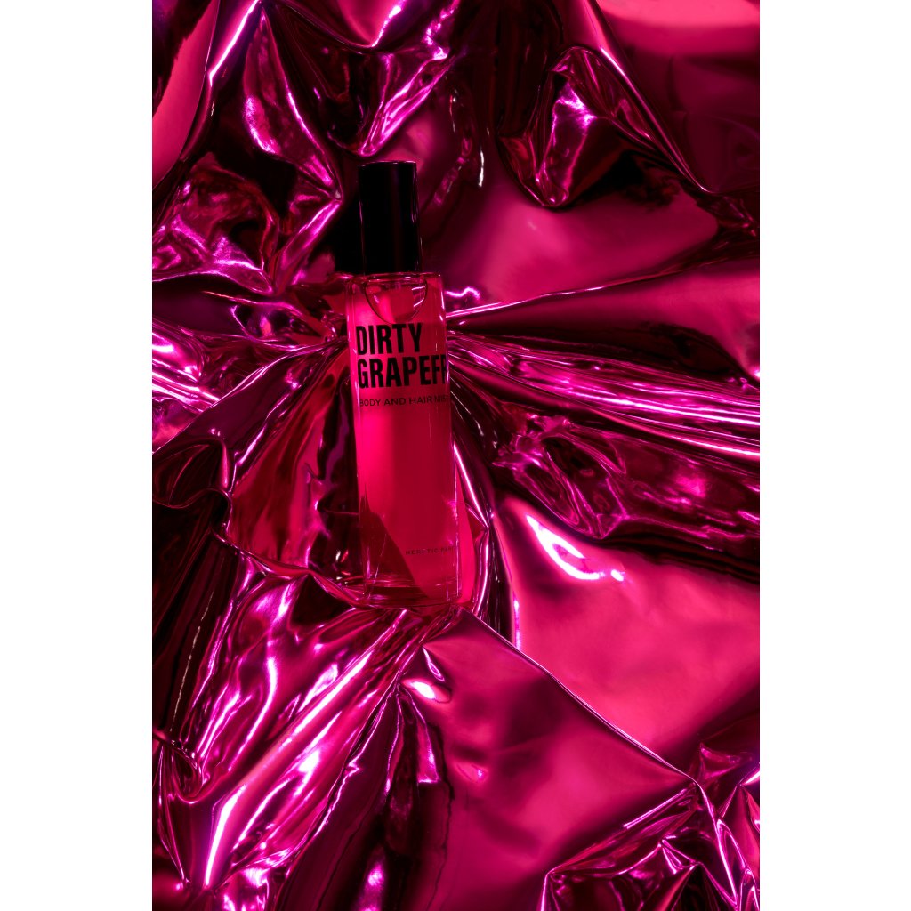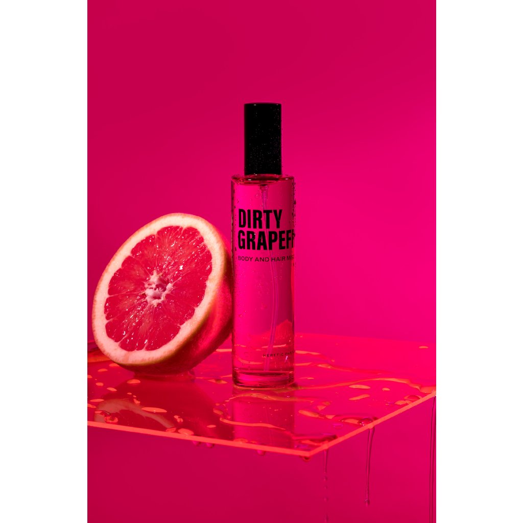 Heretic's Body & Hair Mist - Dirty Grapefruit z přírodních rostlinných ingrediencí nabízí svůdnou vůni plnou šťavnatého růžového grapefruitu na orosených růžových lístcích, osvěženou černým čajem, zeleným vetiverem a nádechem pelargónie.