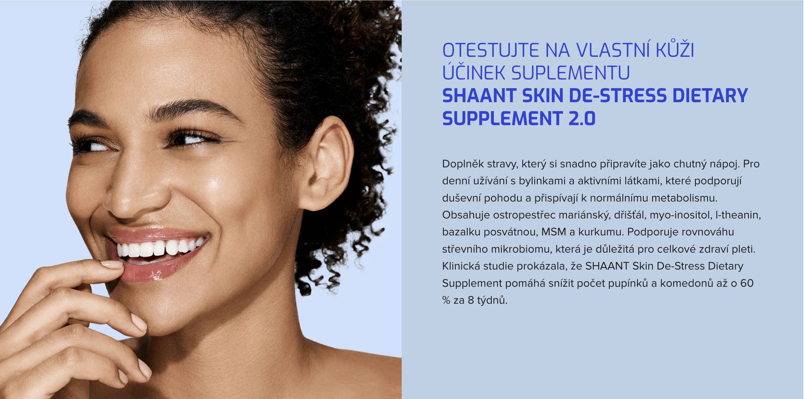 Když povrchová péče nestačí, je čas podpořit pleť zevnitř. SHAANT Skin De-Stress Supplement pomáhá regulovat nadprodukci kožního mazu a prokazatelně snižuje projevy akné až o 60 % za 8 týdnů.