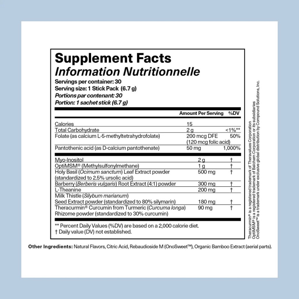 Folate, Pantothenic Acid, Sodium, Myo-Inositol, Methylsulfonylmethane, Organic Holy Basil Extract (Ocimum sanctum leaves), Turmeric Root Extract (Curcumin longa), (50mg curcuminoids), Barberry Root Extract (Berberis vulgaris), L-Theanine, Milk Thistle Extract (Silybum marianmum), (140 mg Silymarin).
