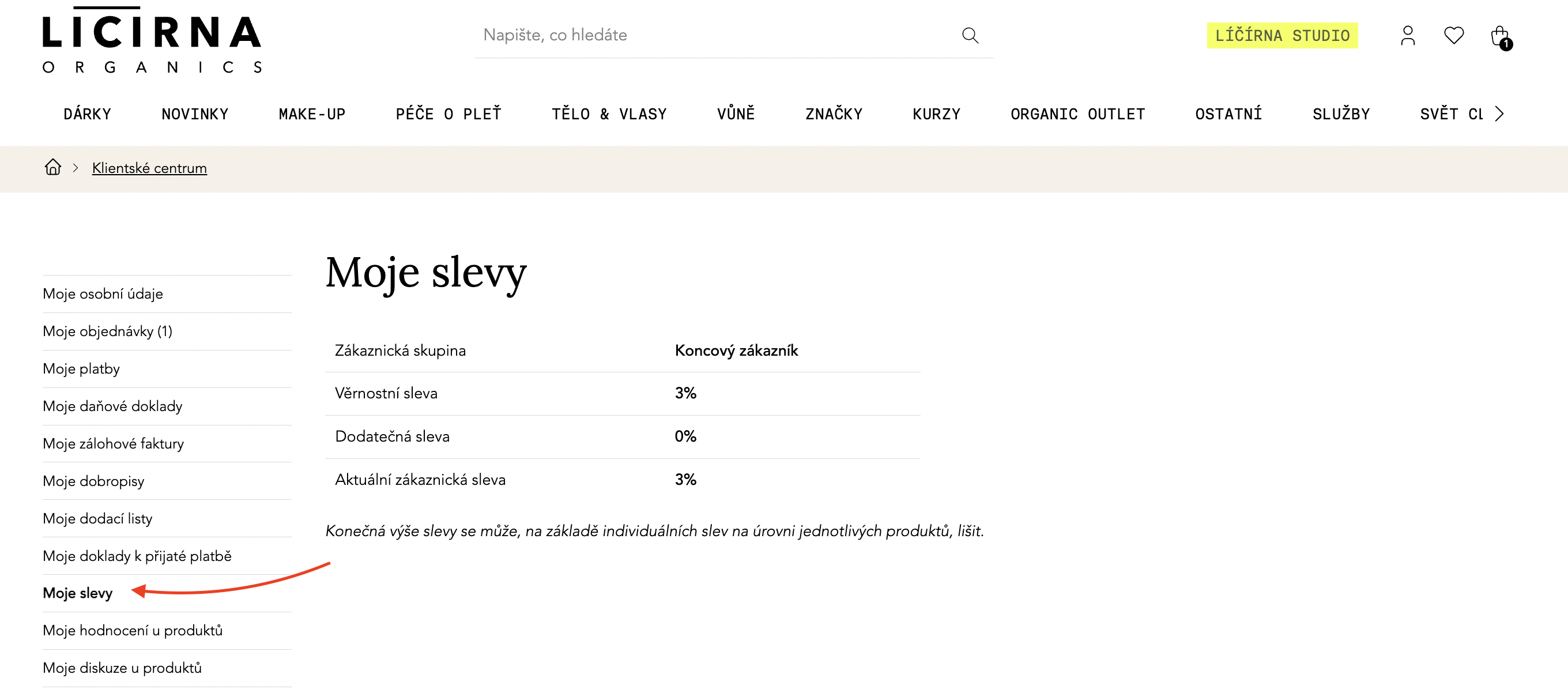 Po kliknutí na panáčka vpravo nahoře se dostanete do klientského centra, kde najdete shrnutí vašich objednávek. V levém menu pak v sekci Moje slevy zjistíte, jakou výši slevy právě máte.